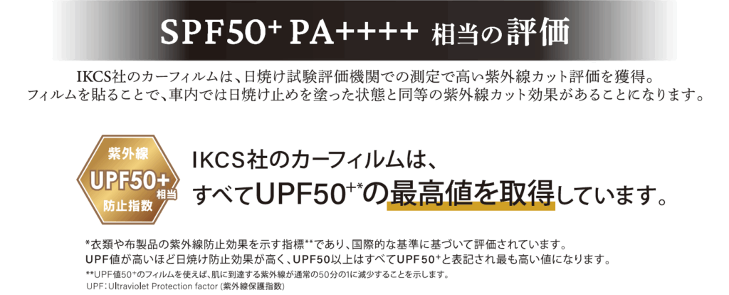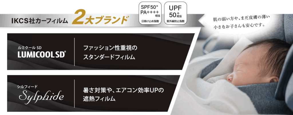 フィルムは視界性耐久性(色アセ)に優れたMADE IN JAPANのアイケーシーフィルムのUVカット機能に優れたルミクールSD・UVカットだけでなく遮熱効果もあるシルフィードの2種類を使用しています。